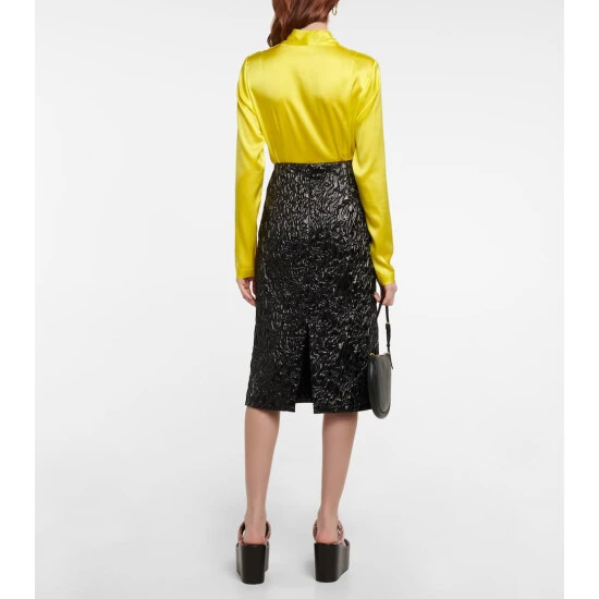 After dark events call for glamorous separates like this midi skirt from Dries Van Noten. It’s made from taffeta and it’s embroidered with a swirling pattern.
