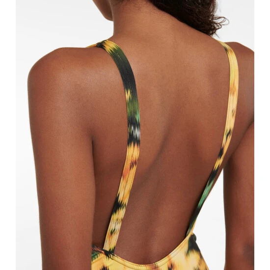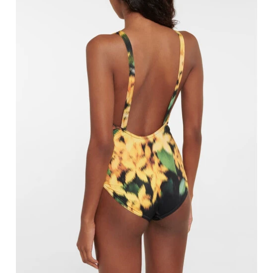 This swimsuit from Dries Van Noten is shaped to a a simple silhouette that artfully showcases a distorted floral print.