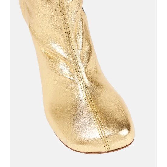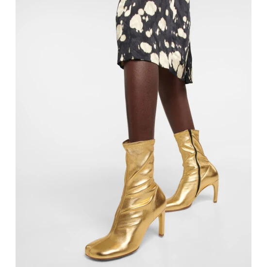 These opulent boots from Dries Van Noten showcase the brand’s signature wide toe boxes and curved heels. They’re made from gold-tone metallic leather.
