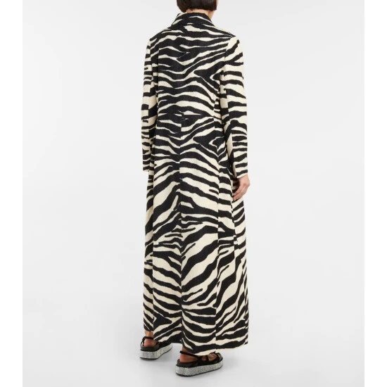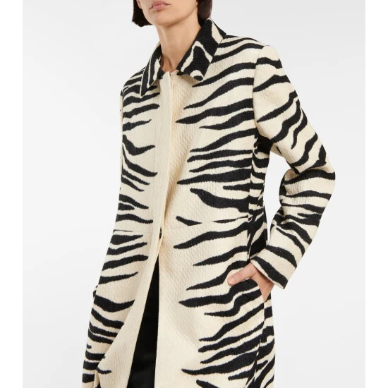 Dries Van Noten’s coat is a prime example of the meeting point between minimalism and maximalism. Its simply shaped silhouette, complete with a concealed button stand, is decorated with a striking animal-print motif.