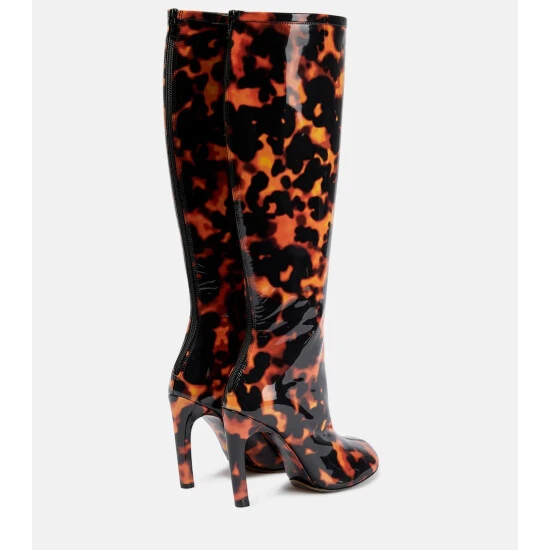 Printed with a tortoiseshell motif, these banana-heeled boots from Dries Van Noten are crafted from glossy leather. They have a knee-high silhouette and zippers along the back seams.