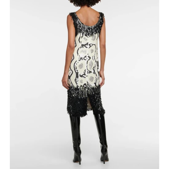 This disco ball of a dress is hand-embroidered with sequins in a snakeskin pattern with beaded fringing. Like all of Dries Van Noten’s pieces, the mesh style is designed for those who like to stand out.